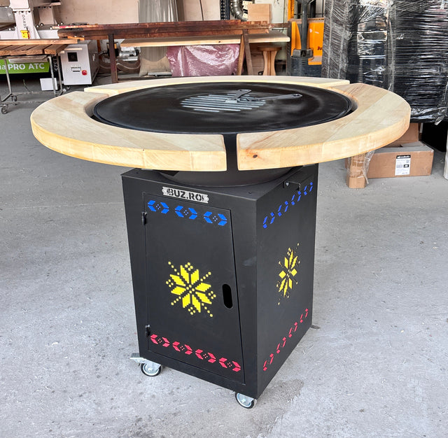 Gratar Gradina Rotund plita 10 mm Fire Pit 73 cm din fier pe lemne, pentru terasa LEMN Blat Tei SI MOTIVE TRADITIONALE