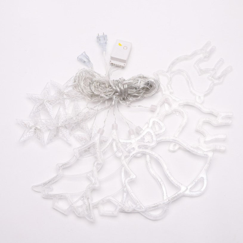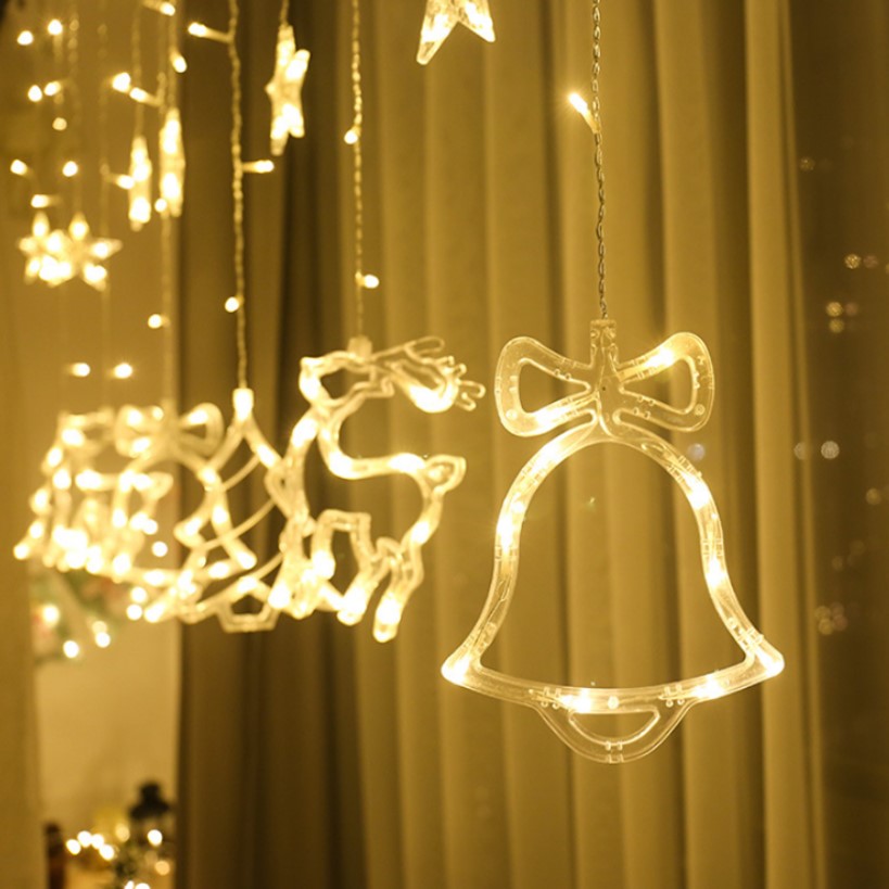 Instalatie craciun perdea luminoasa cu figurine brazi, reni si clopotei, 4m, alb cald
