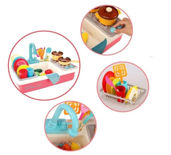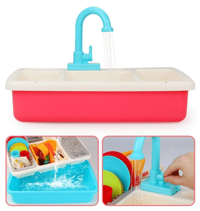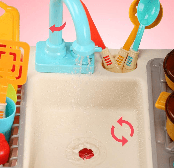 Setul de joaca "Chiuveta de bucatarie cu robinet" este o jucarie captivanta si educativa pentru copii, care ii introduce in lumea minunata a bucatariei si ii incurajeaza sa isi dezvolte abilitatile de gatit si de organizare. Acest set complet vine echipat cu o chiuveta de jucarie realista, un robinet functional si o varietate de vase si ustensile, oferind copiilor o experienta de joc realista si plina de distractie.Chiuveta de bucatarie realista:Design atractiv: Chiuveta este realizata pentru a imita aspectul si functionalitatea unei chiuvete reale, cu detalii realiste si atractive care vor captiva atentia copiilor.Robinet functional: Robinetul poate fi activat pentru a elibera "apa", oferind o experienta interactiva si realista de joc.Vase si ustensile de bucatarie: