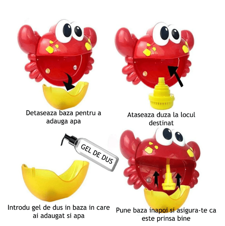 Tot ce trebuie să faceți este să adăugați soluția de săpun în compartimentul dedicat și să porniți jucăria — distracția începe instant! 🧴💦