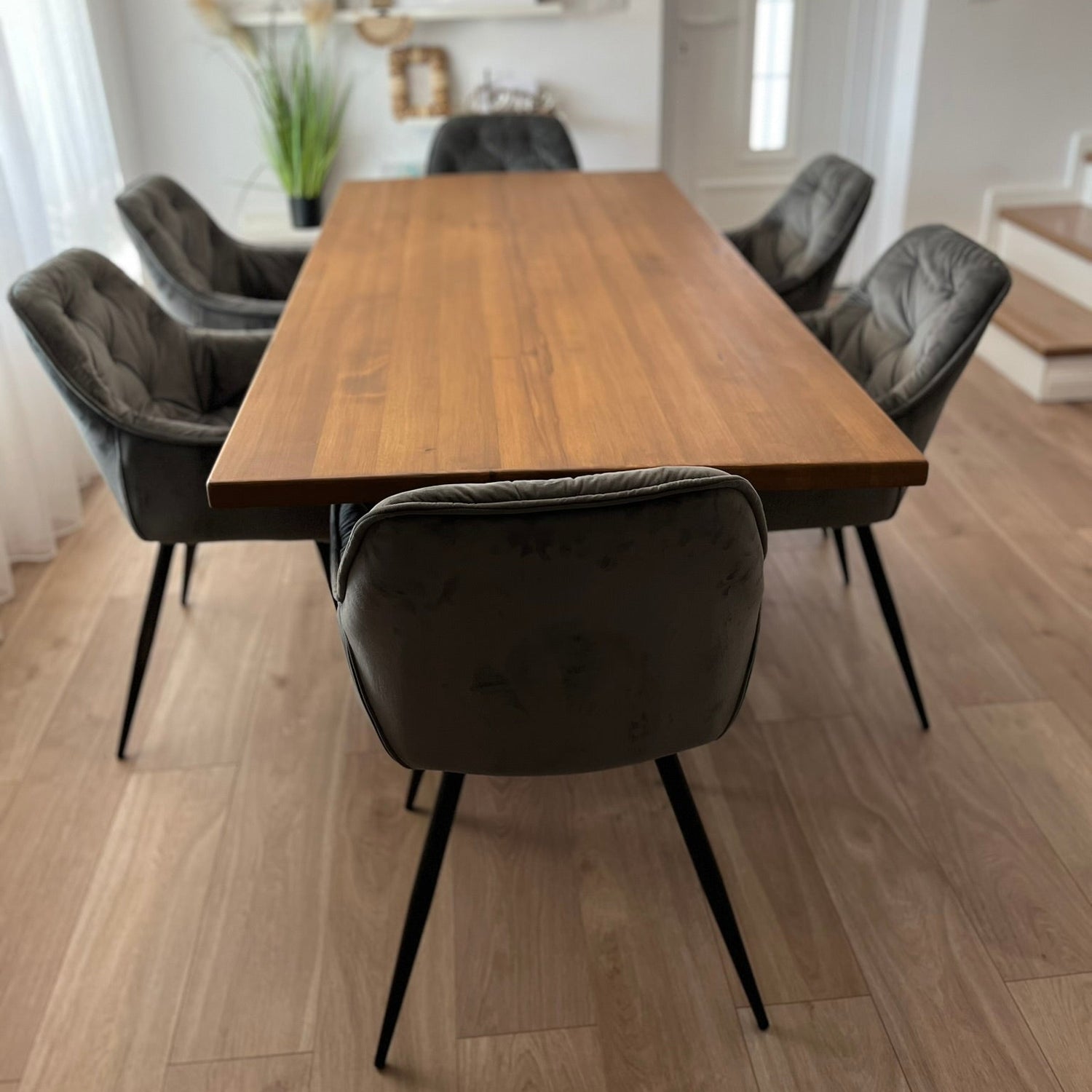 Set masa cu scaune bucatarie, dining,living, sufragerie, blat din lemn masiv cu picioare metalice, scaune husa gri, 6 persoane, SABRINA