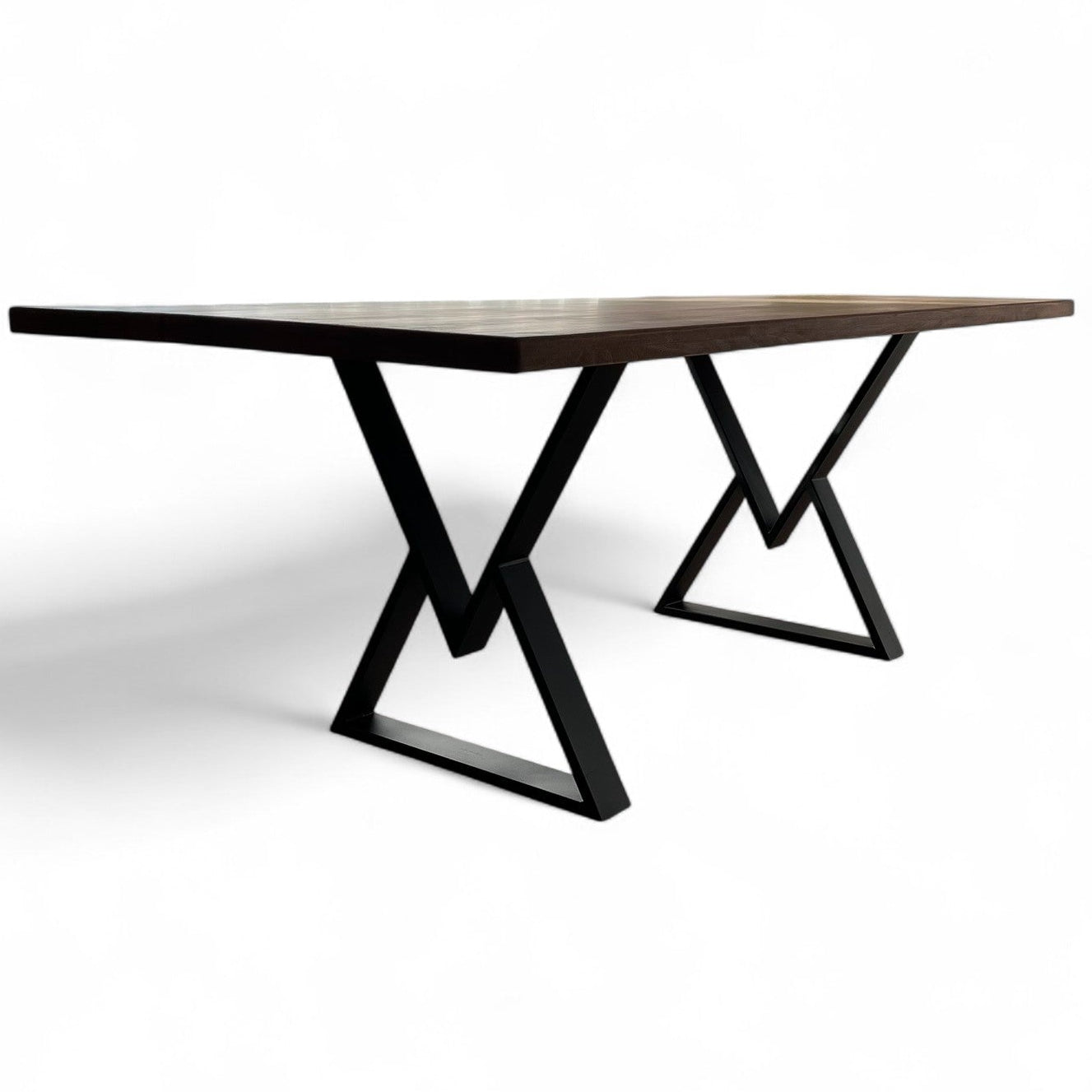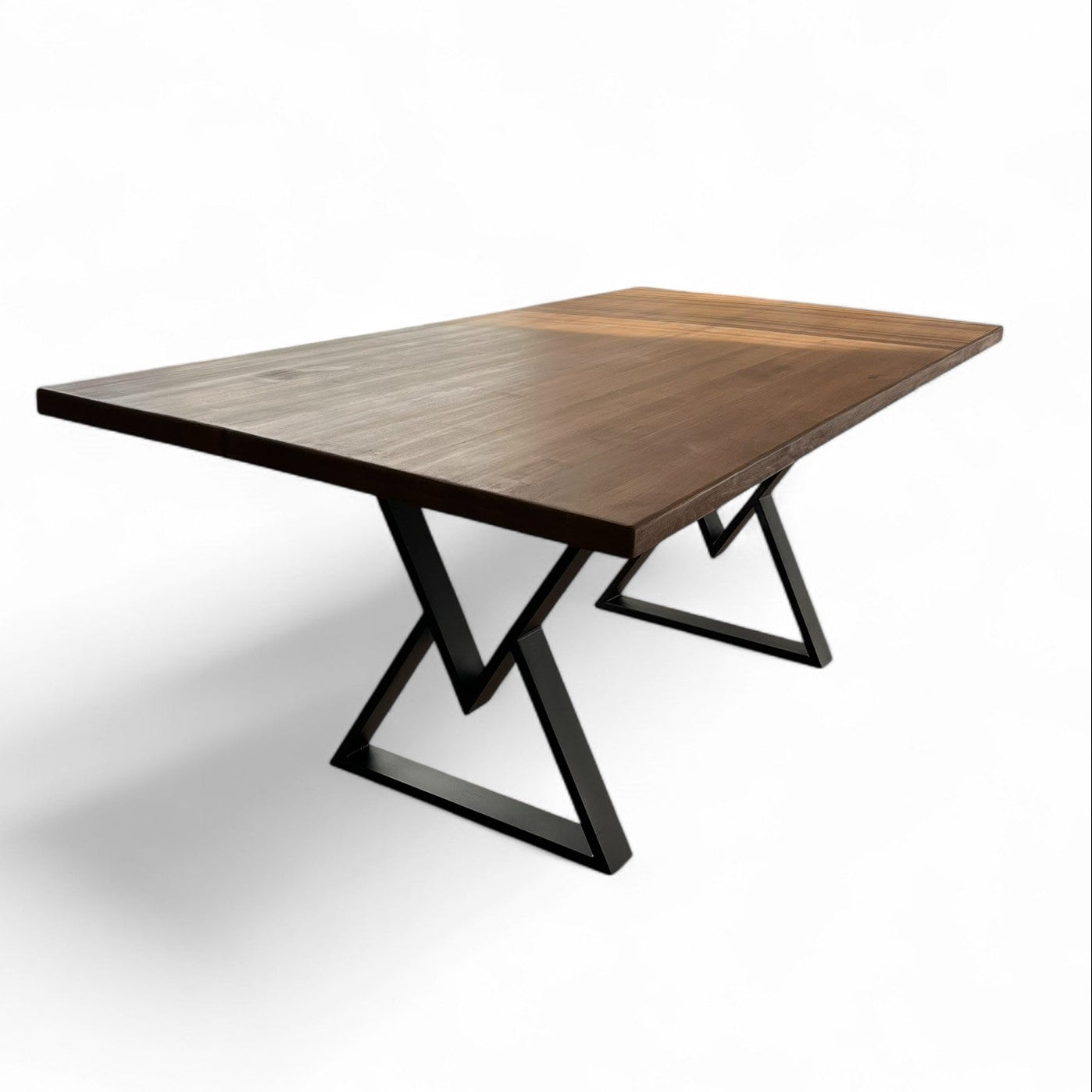 Masă dining din lemn masiv cu bază metalică geometrică – 200×95×78 cm, blat 3,5 cm