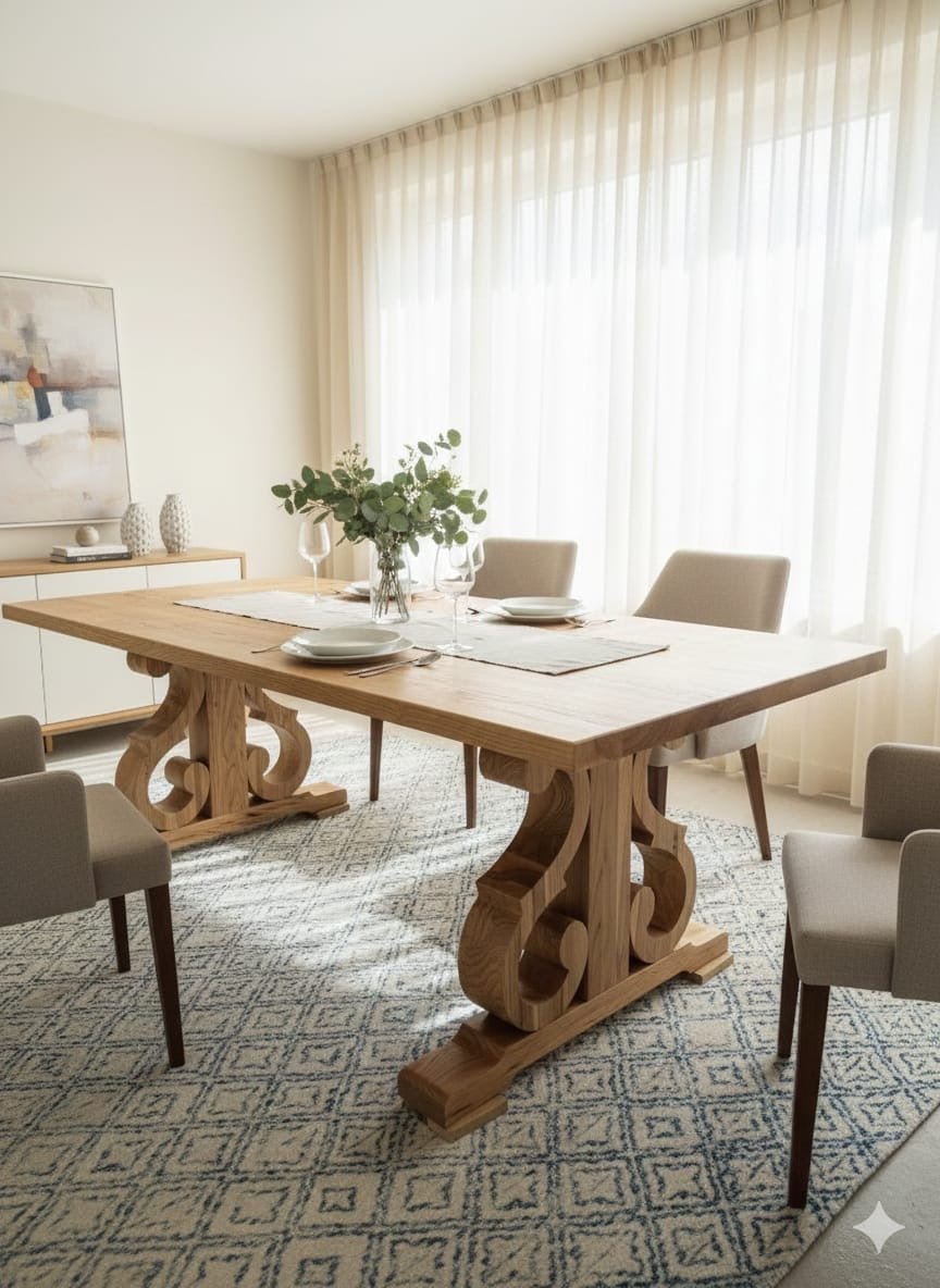 Masa Ofelia este alegerea ideală pentru cei care apreciază autenticitatea lemnului masiv și își doresc o piesă de mobilier durabilă, cu personalitate. Fiecare masă este unică datorită variațiilor naturale de culoare și textură ale lemnului.