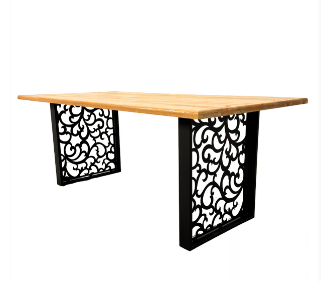 Blatul este tratat cu ulei natural transparent, păstrând frumusețea fibrei și protejând în același timp suprafața. Picioarele metalice vopsite completează armonios ansamblul, oferind un contrast elegant și o notă industrială discretă.