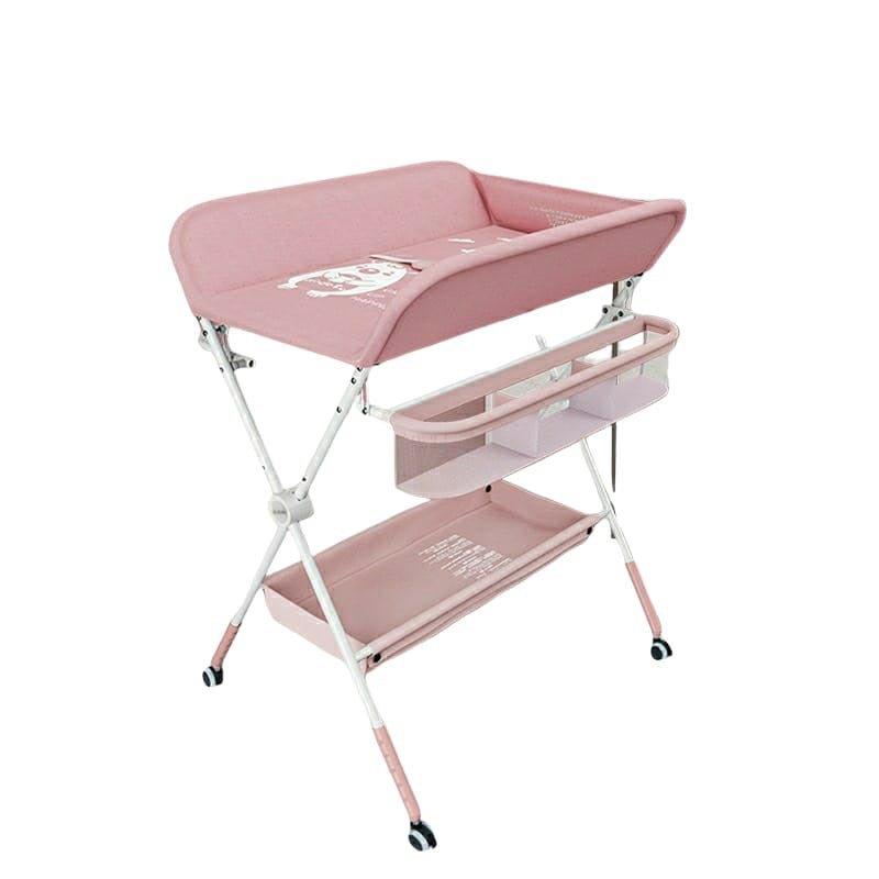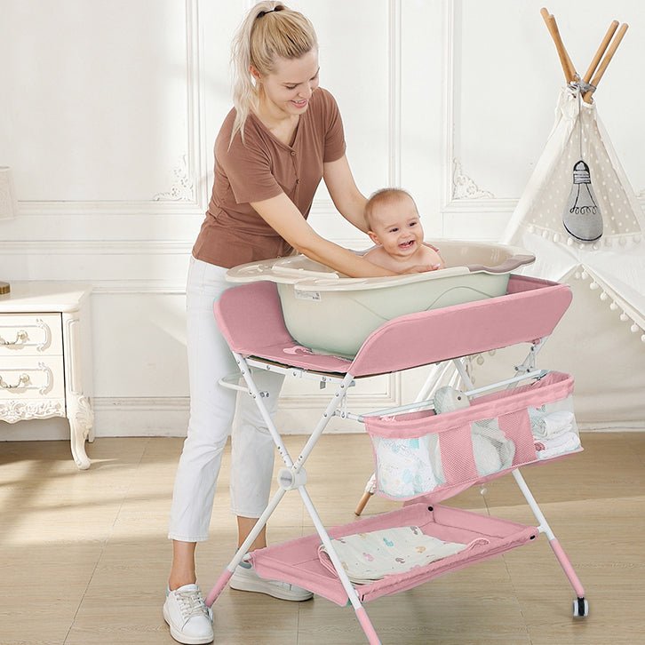 Masa de infasat si schimbat scutecele, multifunctionala, pliabila, cu cos de depozitare, roz, 77x 59 cm