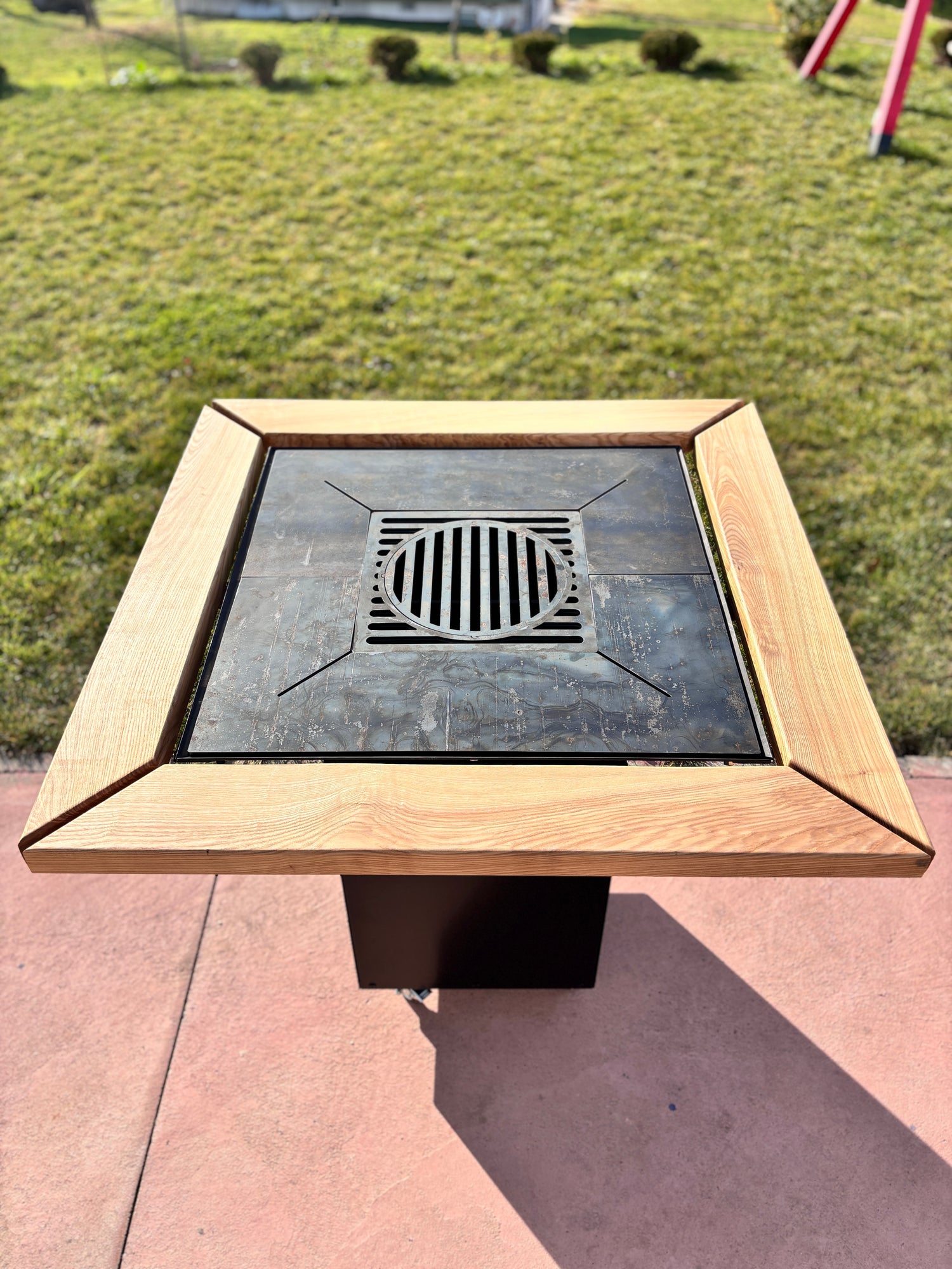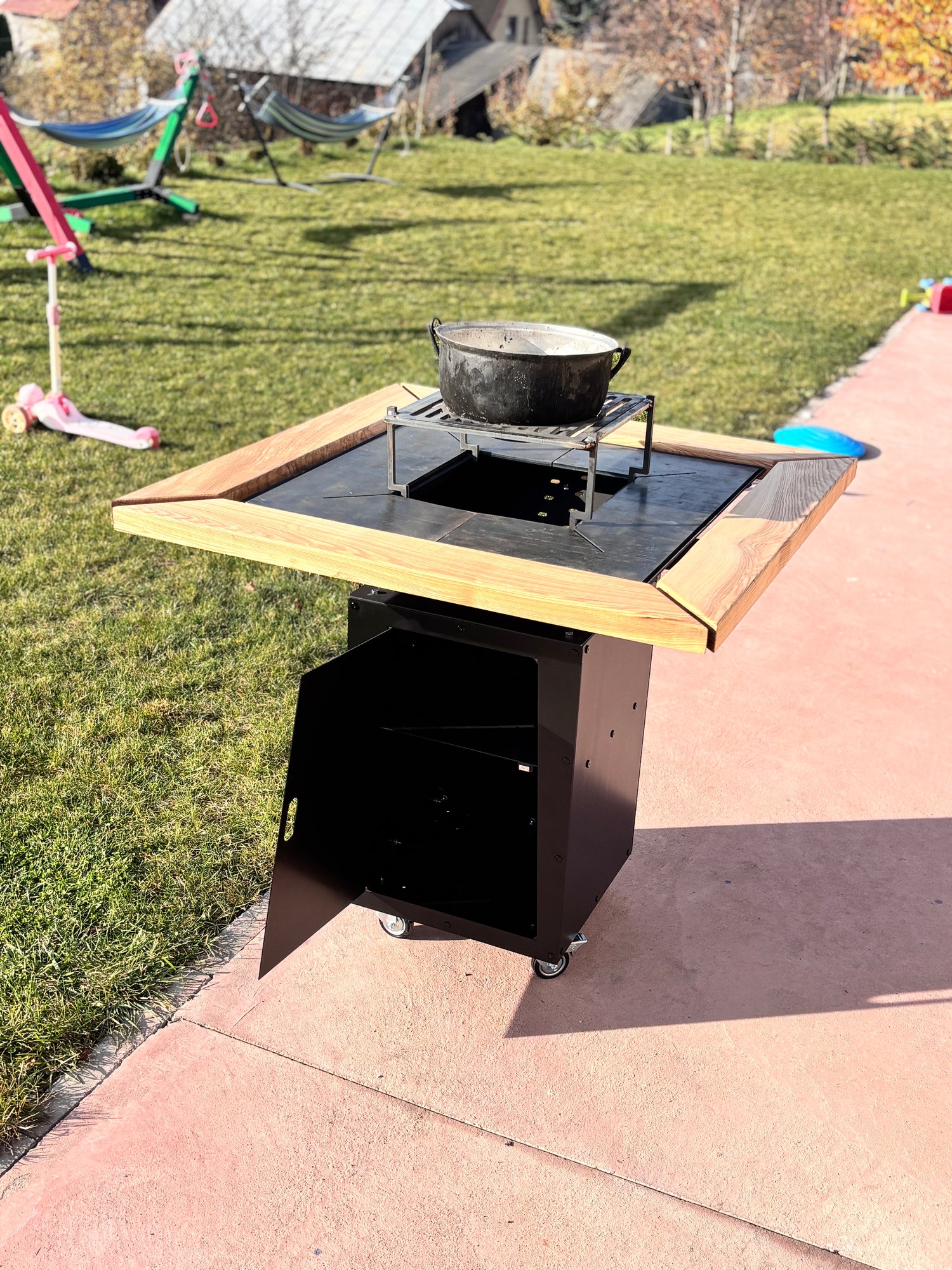Gratar de gradina Demontabil, 5 in 1 ,fire pit cu Plita 10 mm Otel 72x 72 cm ,Cu Blat din Lemn,Suport Ceaun/Disc ,Gratar de curte