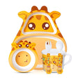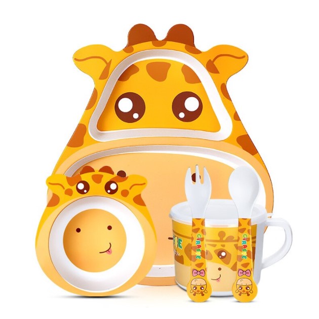 Set de masa din fibra de bambus, pentru copii, farfurie 2 compartimente, cana, bol, furculita si lingurita, girafa