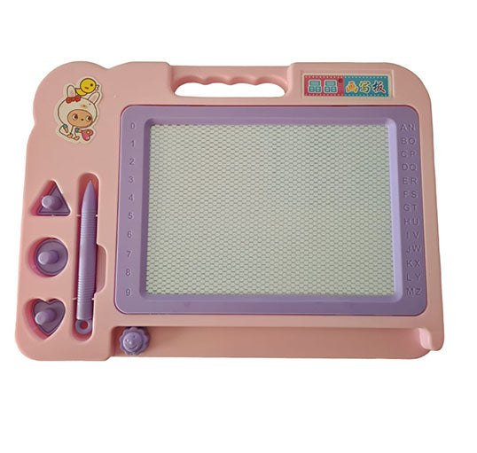 Tablita magnetica, cu stilou, 3 stampile magnetice diferite, cerc, triunghi si inimioara, bara ce sterge scrisul, dimensiune 27x20, culoare roz
