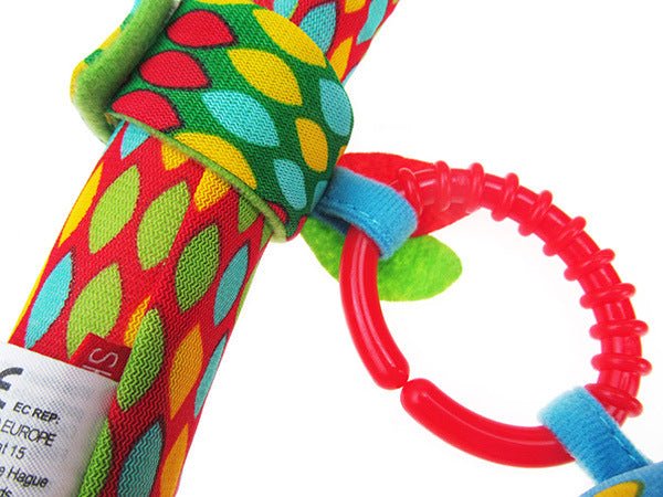 - Stimulare multiplă: Sunete zornăitoare, texturi variate și culori vii pentru simțul vizual, auditiv și tactil.