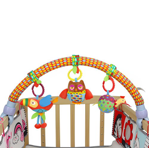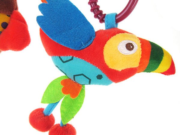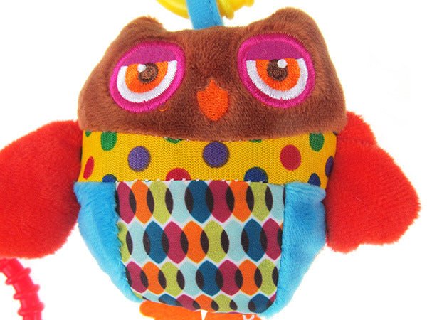 Bara de activitati cu jucarii senzoriale pentru bebelusi, balansoar, patut sau carucior, bufnita, papagal, gaina
