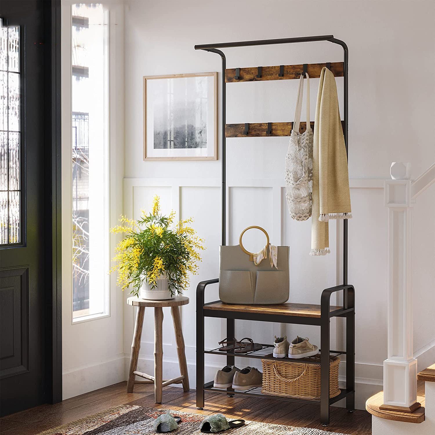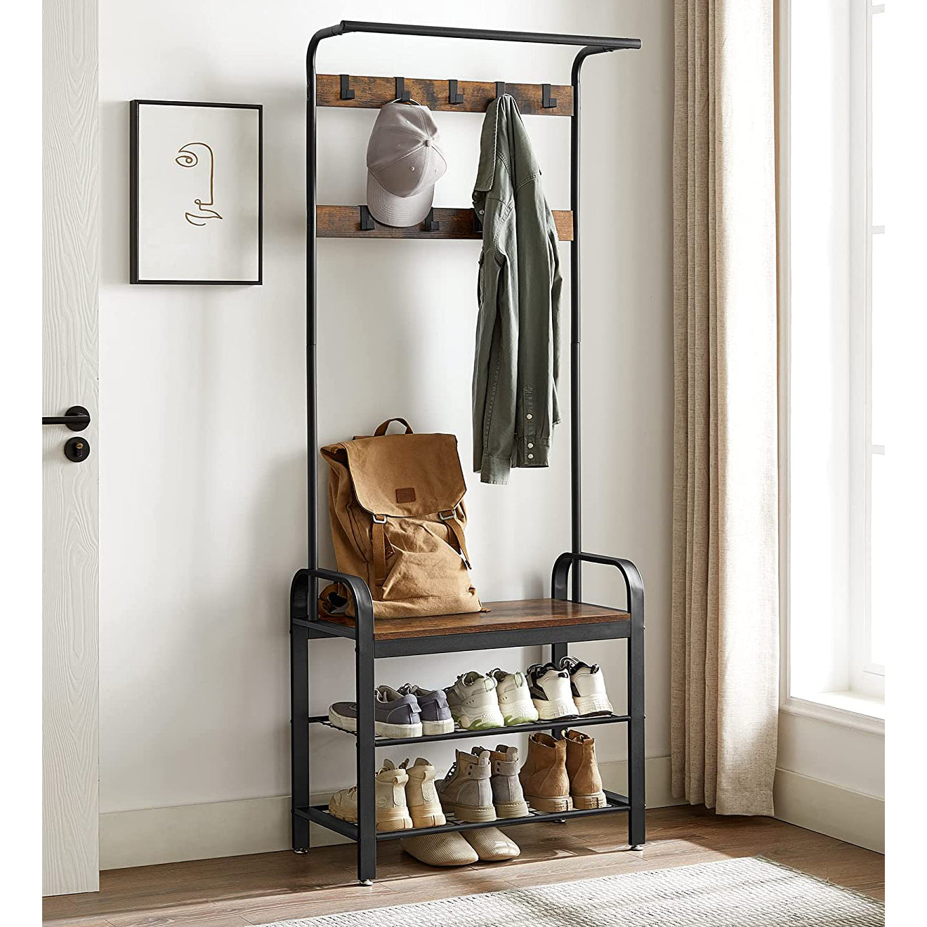 Cuier haine cu suport pantofi, 9 agatatori, 2 rafturi si bancuta, maro, 183x77 cm