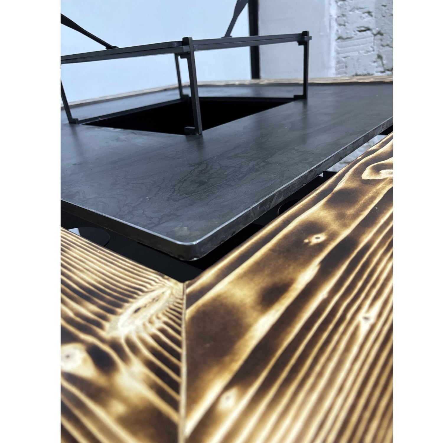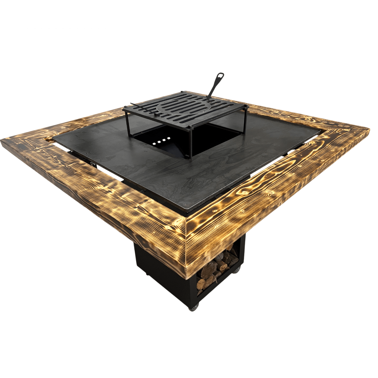 Fire Pit, Gratar cu plita 95 x 95 cm din otel 8 mm pe lemne, pentru gradina sau terasa+ grill detasabil + blat lemn