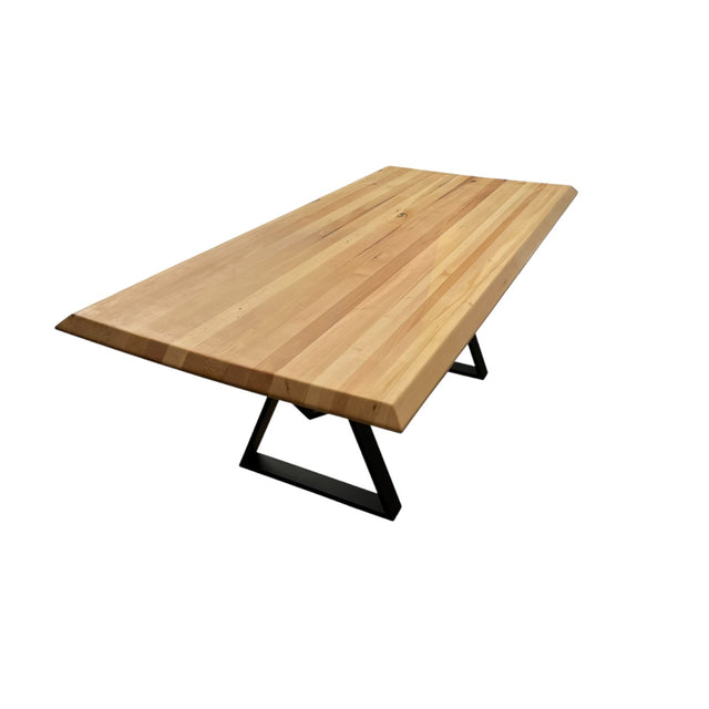 Accent premium pentru zona de dining – blat din lemn masiv cu textură naturală, muchii teșite și bază metalică tip trestle în finisaj negru mat. Stabilă, spațioasă și gândită pentru utilizare zilnică.