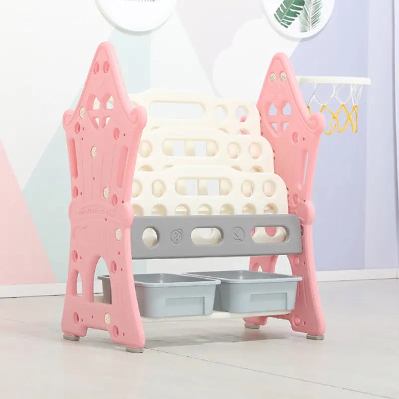Organizator pentru jucarii si carti, cu 4 rafturi si 14 cosulete depozitare, cos baschet, ABS, 124cmx36cmx72cm, roz
