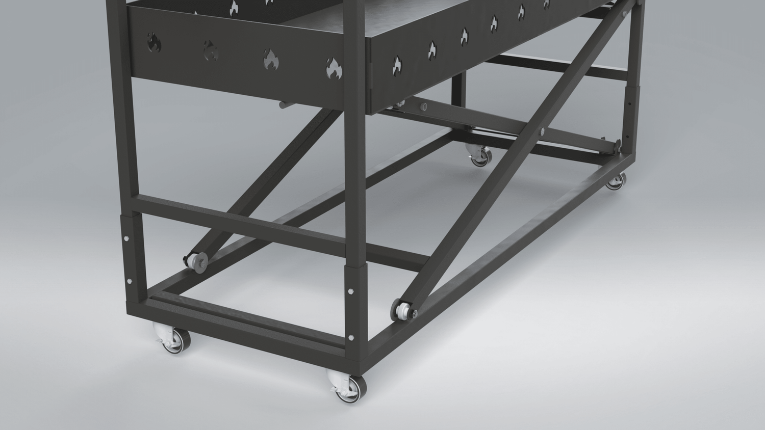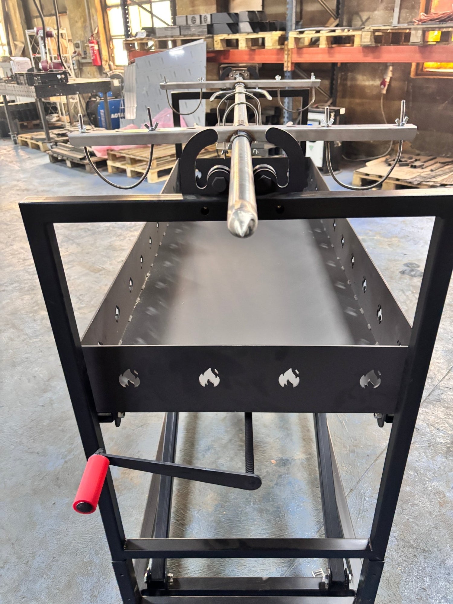 Focarul este reglabil pe înălțime, fiind placat cu cărămidă de șamotă, ceea ce permite o inertie buna si un control precis al căldurii. Motorul electric profesional de 30W cu turație de 2.5 rpm asigură o rotisare uniformă și lină, chiar și pentru bucăți mari de carne – până la 100 kg.